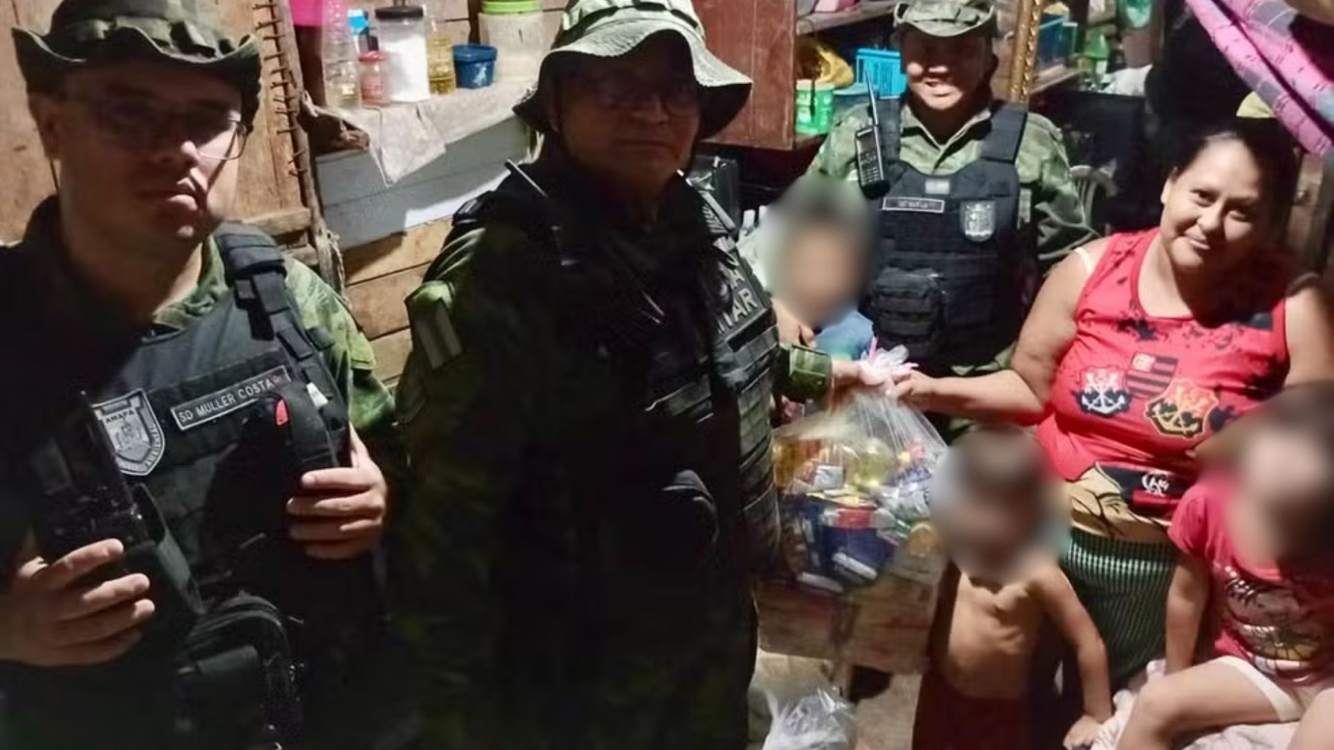 Policiais do Batalhão Ambiental da Polícia Militar do Amapá fizeram uma ação solidária no sábado (6), em Macapá, após encontrarem uma família em situação de vulnerabilidade. O grupo, que tem oito crianças, recebeu doações de alimentos, roupas e dinheiro.