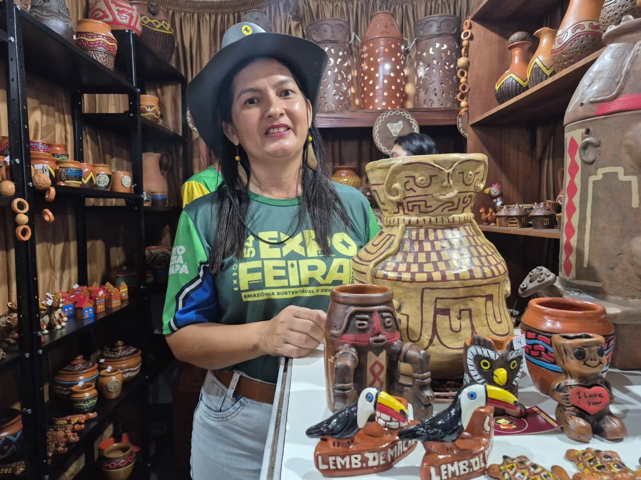 Ezequiele Lima, artesã responsável pelo stand Maracá e Cunani, destaca que o envolvimento familiar na produção é motivo de orgulho.